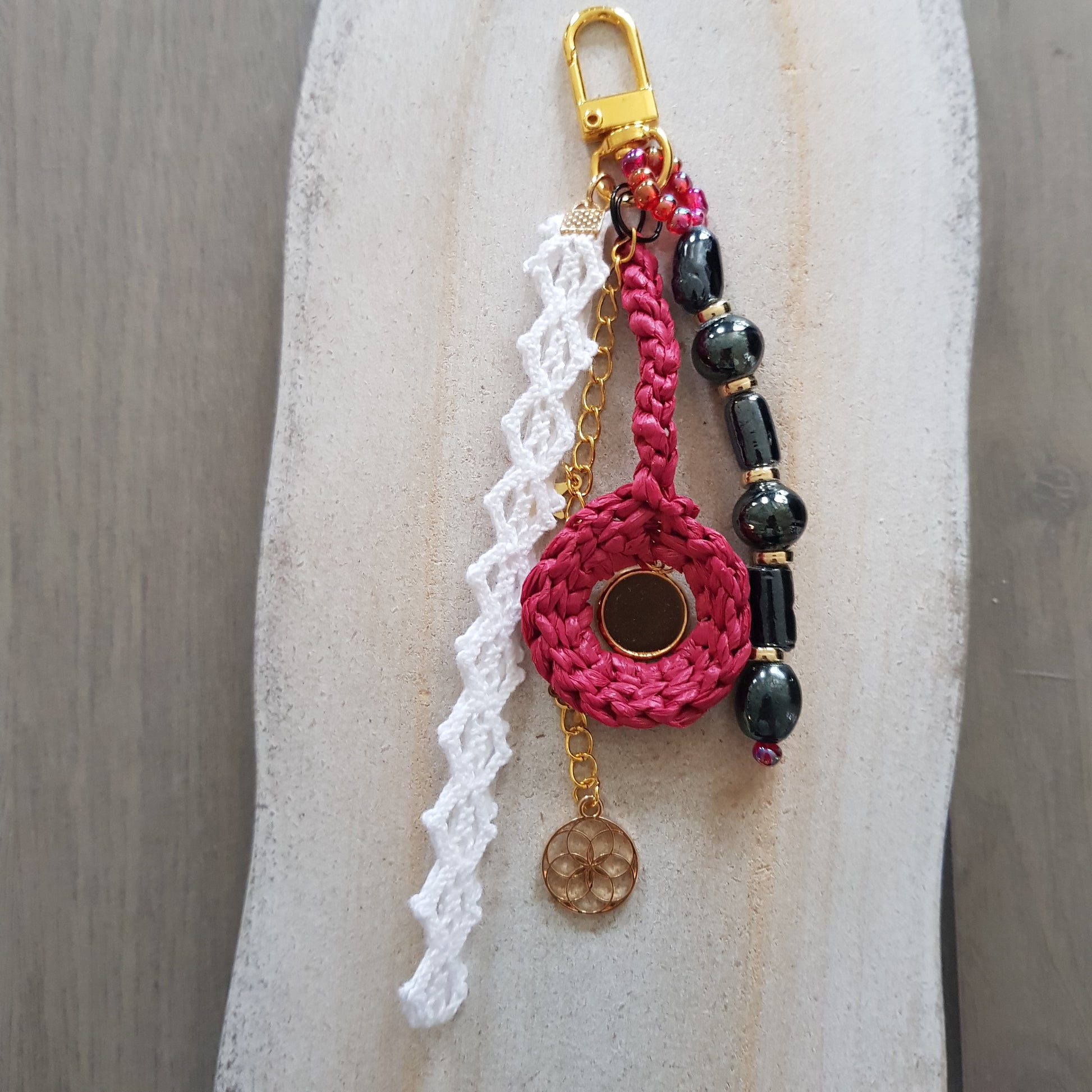 Bijou de sac fait main avec amour. Pendentif crocheté au raphia avec le cabochon à personnaliser à l'intérieur de celui-ci.