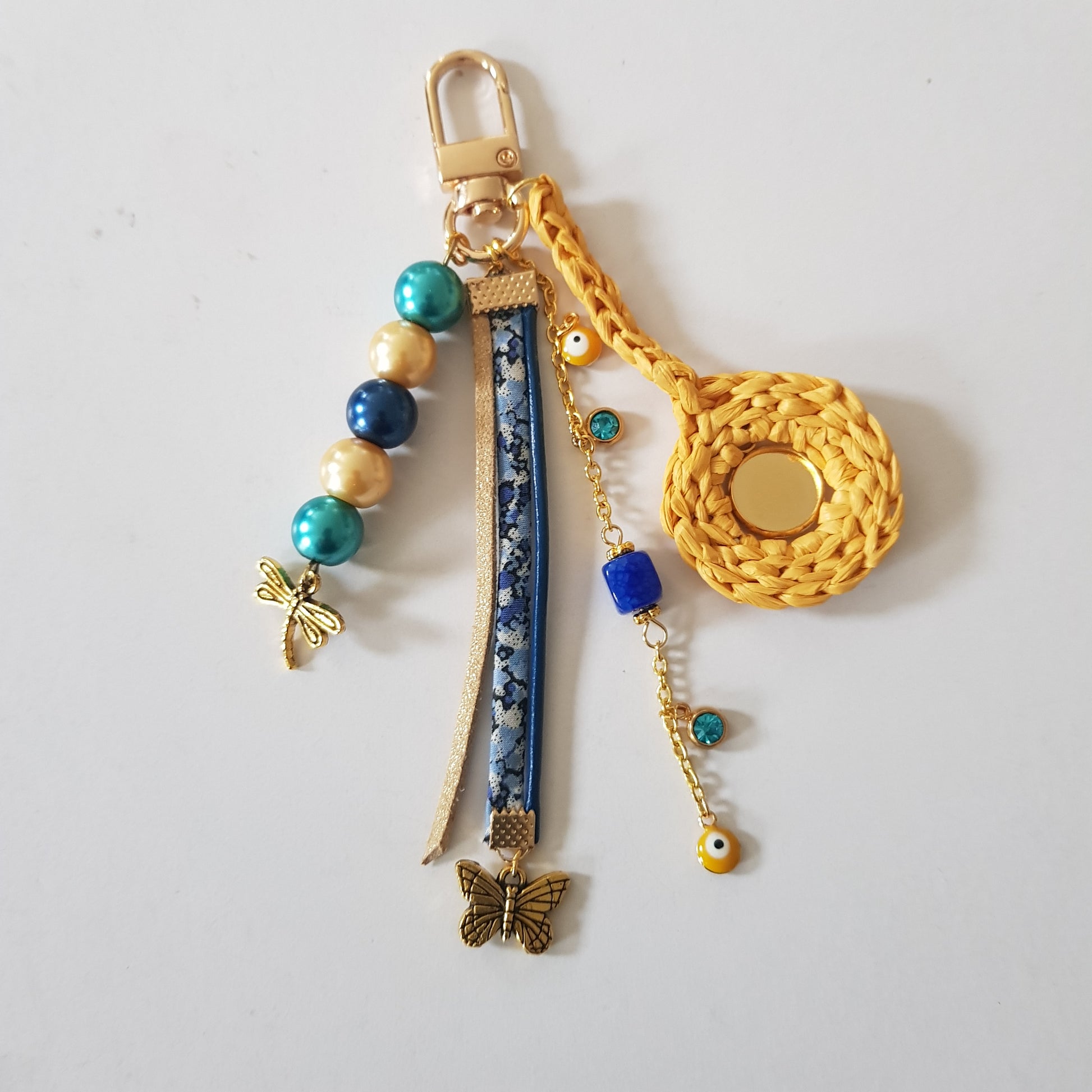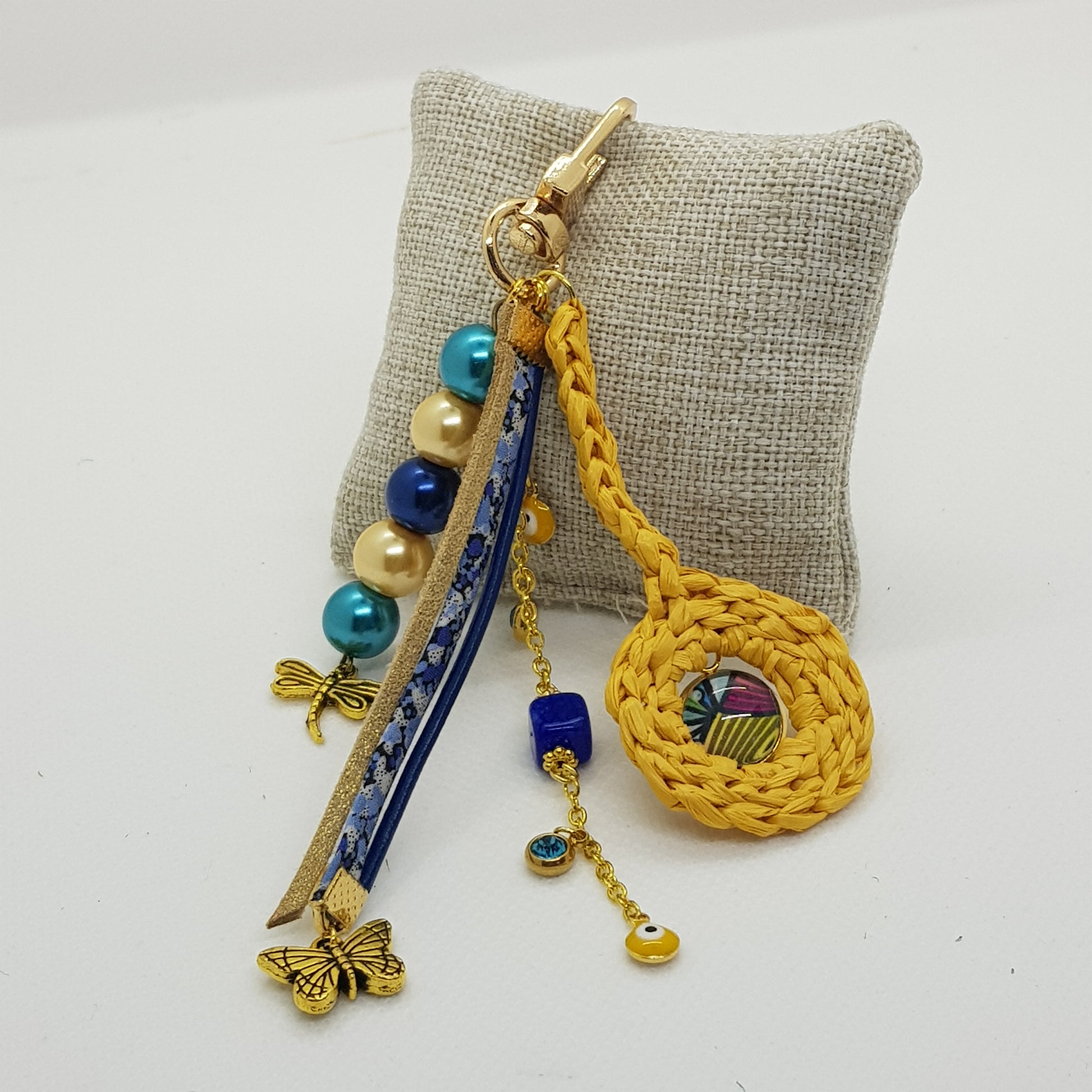Une déclinaison de couleurs bleue, jaune et dorée pour ce modèle à accrocher sur votre sac à main.
