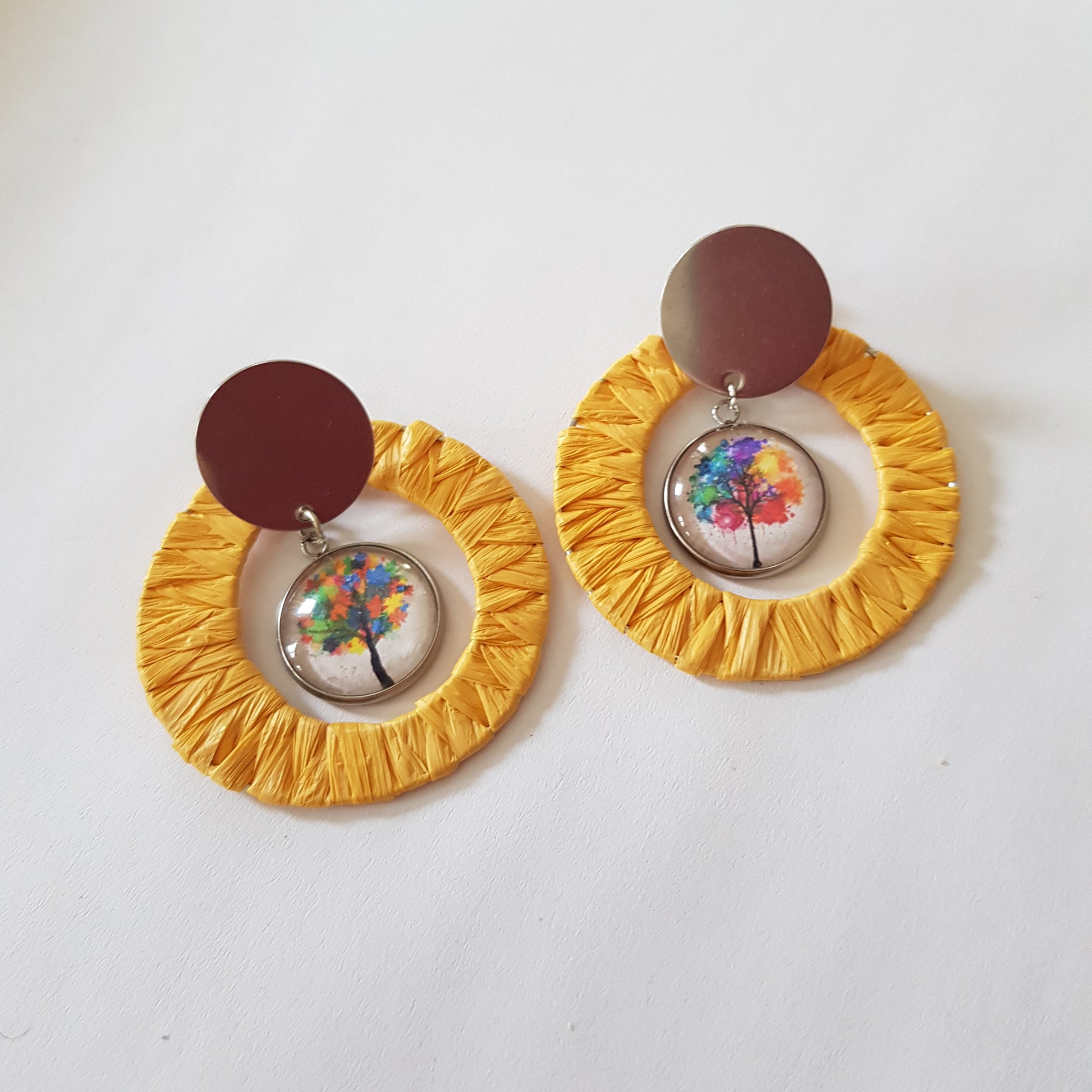 Boucle d'Oreille Artisanale Créole 2-en-1 Raphia Jaune