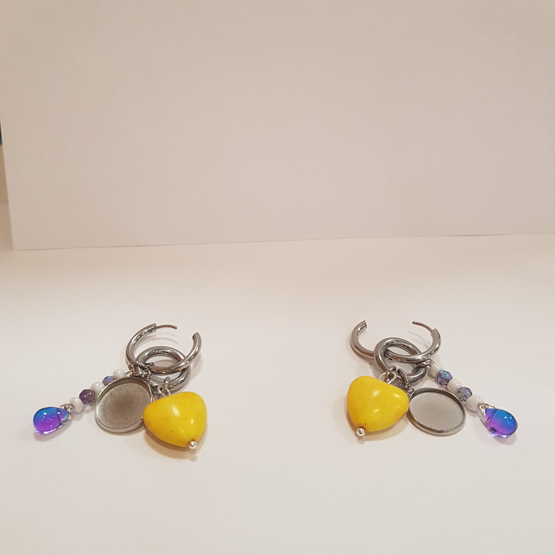 Cette paire délicate se distingue par son design bicolore : un anneau qui accueille une tige de perles, subtilement travaillé dans des tons blancs et violets, accompagné avec un max de LOVE breloque cœur jaune.