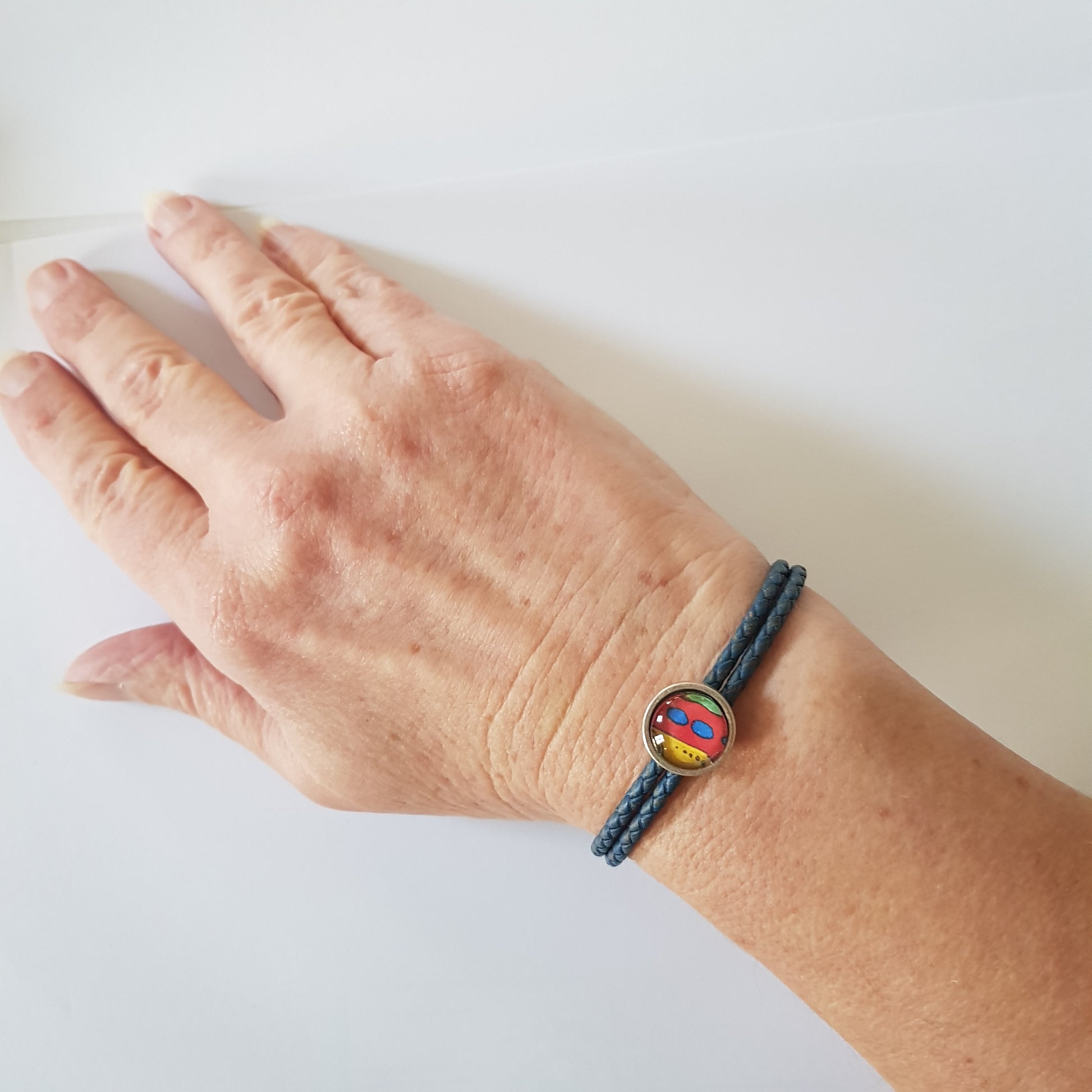Bracelet en cuir tressé avec fermoir magnétique acier, perle coulissante zamak argent antique, avec pierre cabochon à personnaliser. Le décor choisi est le n° 5 thème Feuille Ginkgo sur la photo.