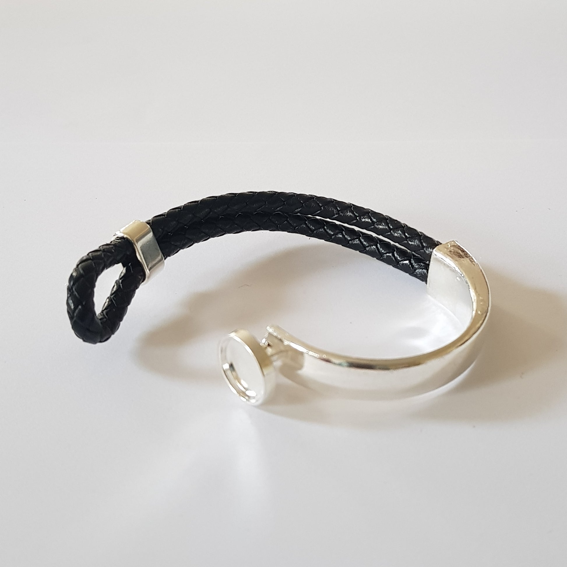 Bracelet en cuir Bolo tressé coloris noir, fermoir demi-manchette argent avec pierre cabochon à personnaliser. Le décor choisi est le n° 8 thème Art Abstrait sur la photo.