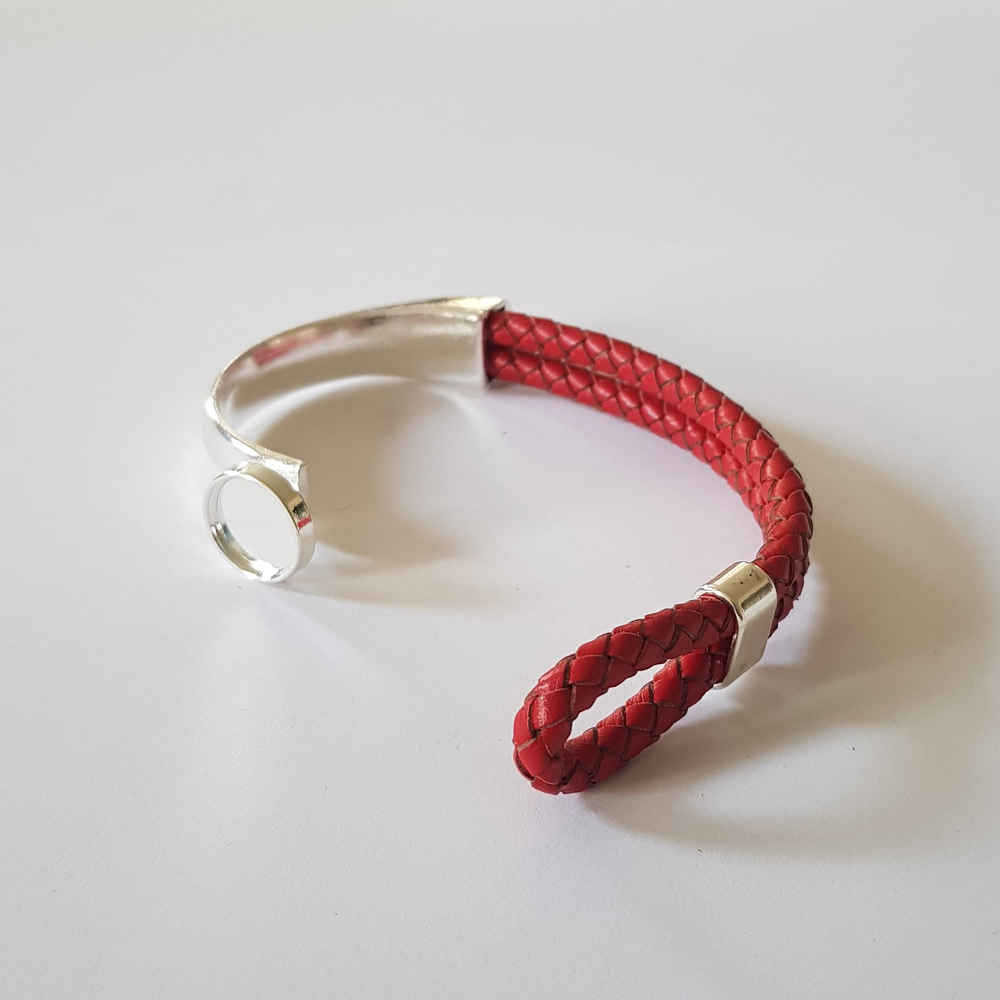 Bracelet en cuir Bolo tressé coloris rouge, fermoir demi-manchette argent avec pierre cabochon à personnaliser. Le décor choisi est le n° 9 thème Modern Art sur la photo.