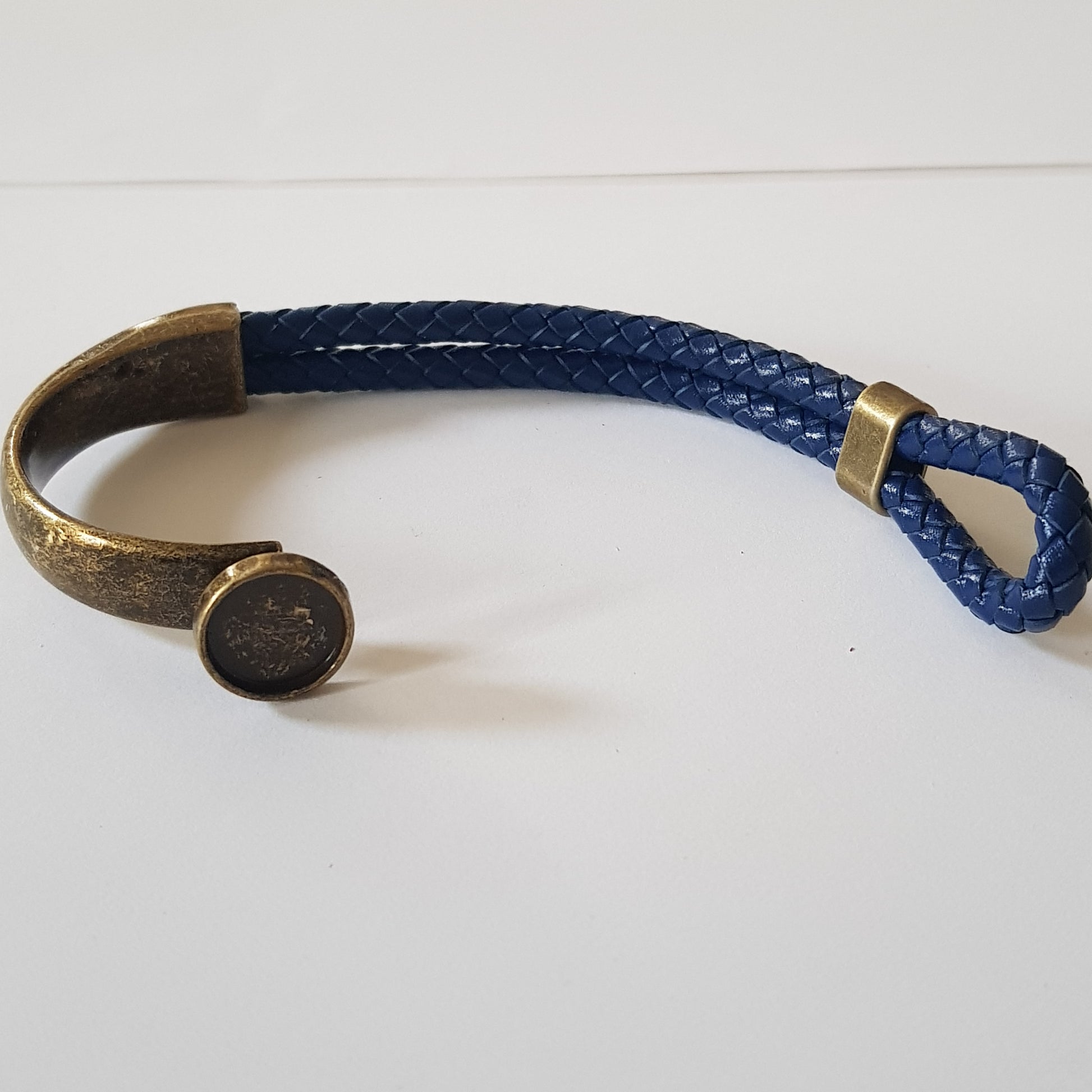 Bracelet en cuir Bolo tressé coloris bleu, fermoir demi-manchette bronze avec pierre cabochon à personnaliser. Le décor choisi est le n° 1 thème Nature sur la photo.