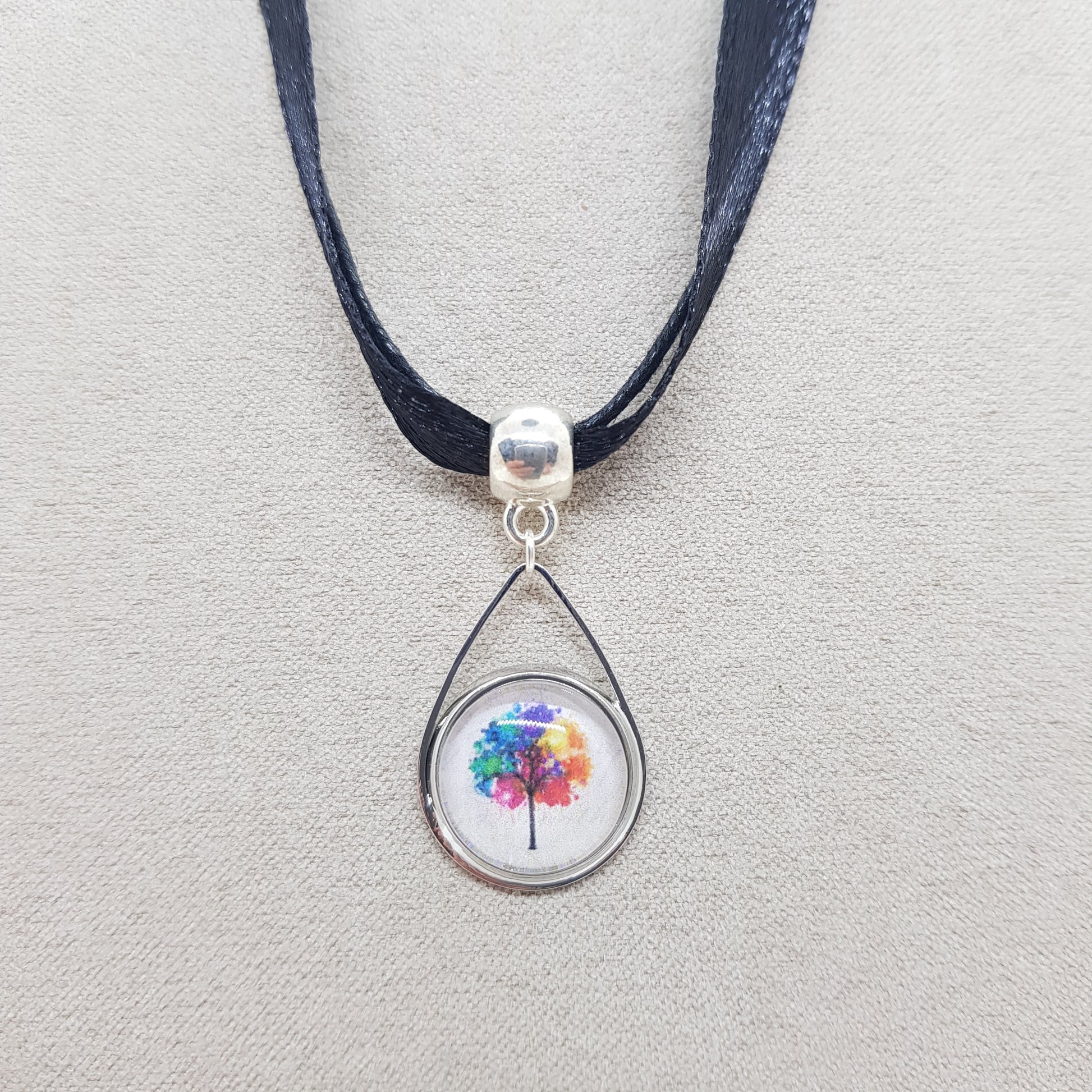 Antiallergique, ce collier est élaboré avec un cordon coton ciré et un ruban de soie noir accompagné de son pendentif en acier inoxydable.