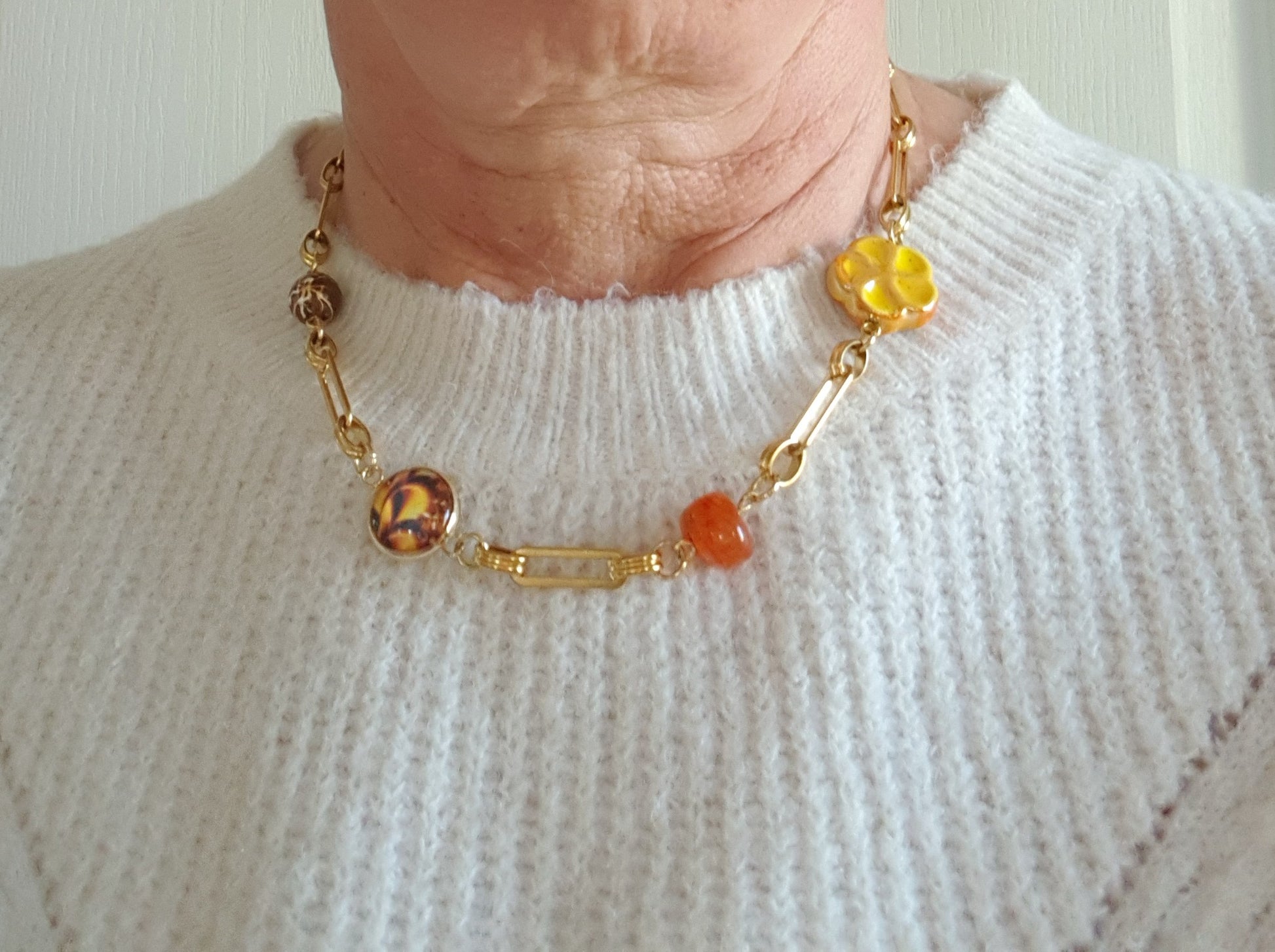 Ce modèle a été monté sur une chaîne maille forçat en intercalant les charms. Sa breloque fleur aux tons jaune et marron apporte une touche poétique et féminine, tout en subtilité.