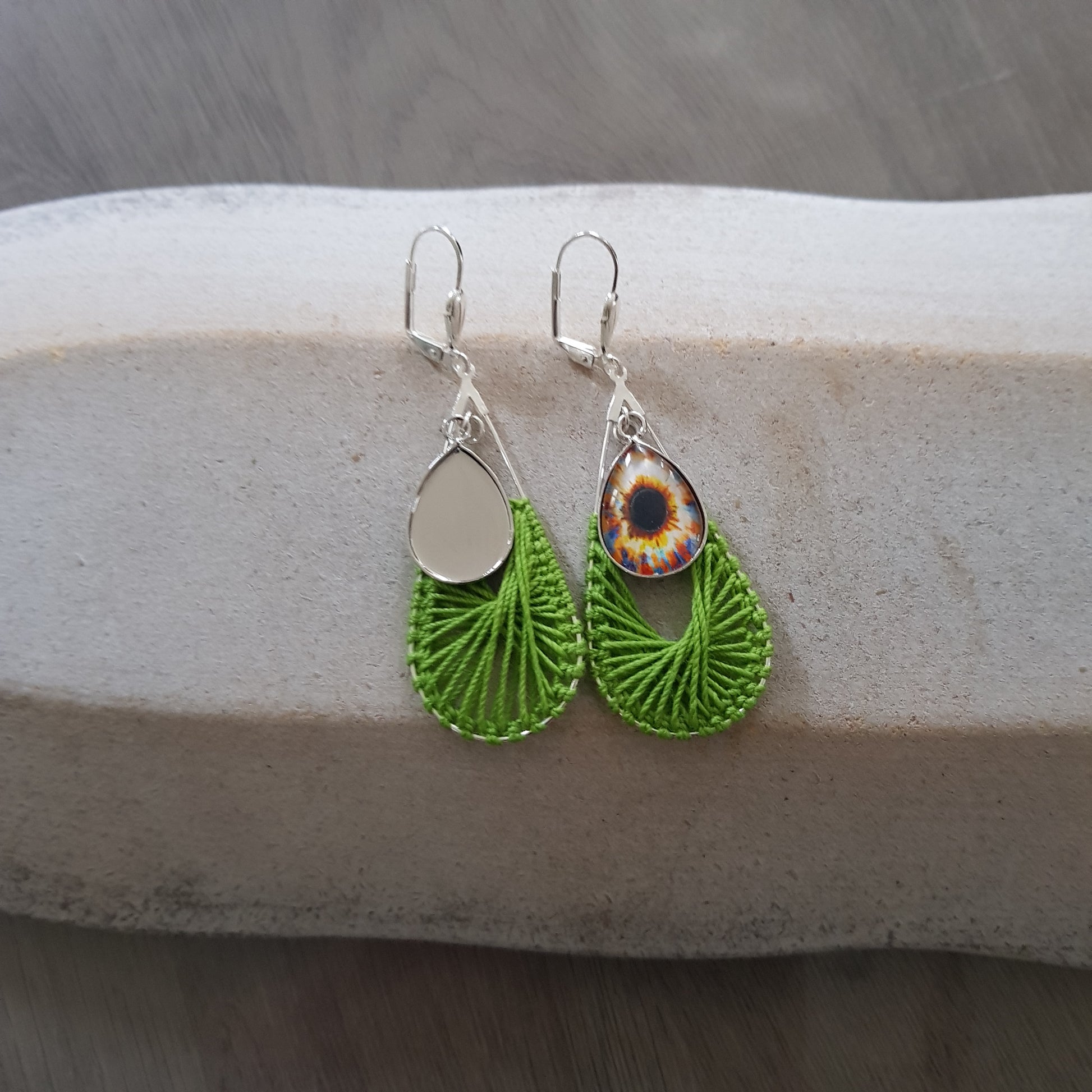 Ces créoles gouttes tendance fait main sont crochetées avec un fil 100 % coton coloris vert.