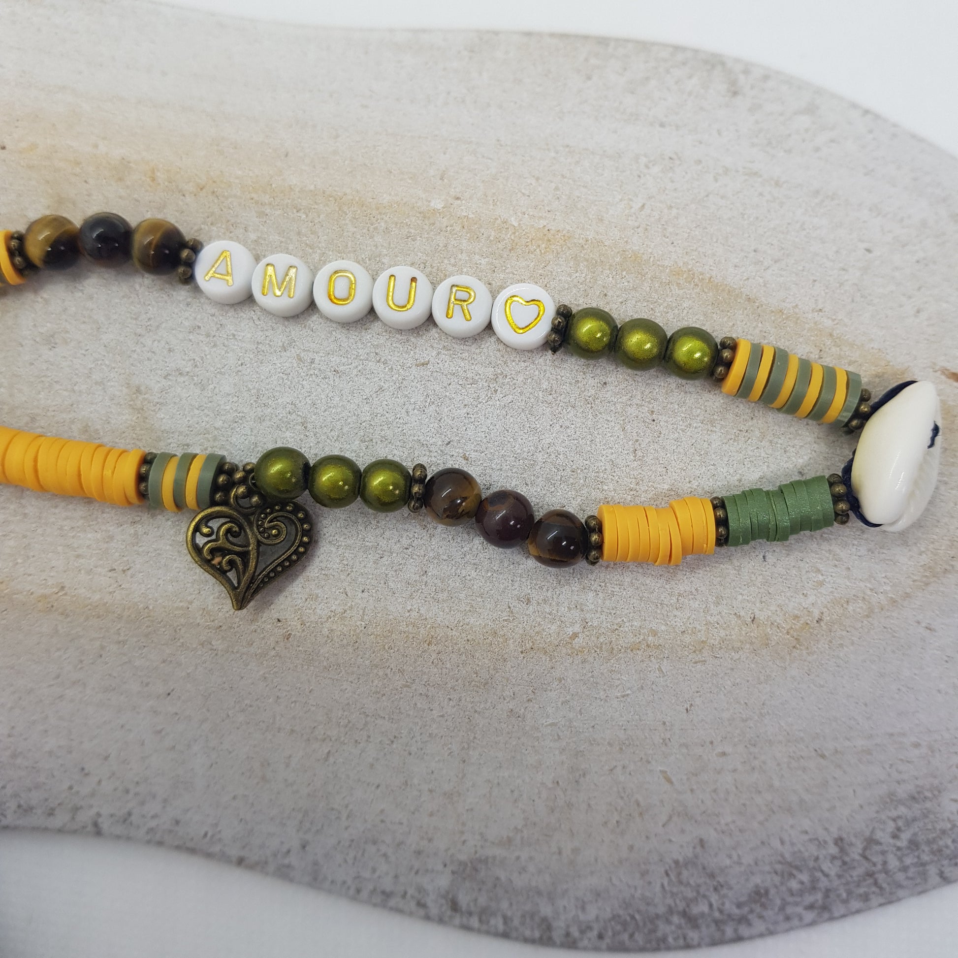 Confectionné avec des perles en verre et heishi, il est orné de perles lettres écriture dorée et monté sur un cordon souple.