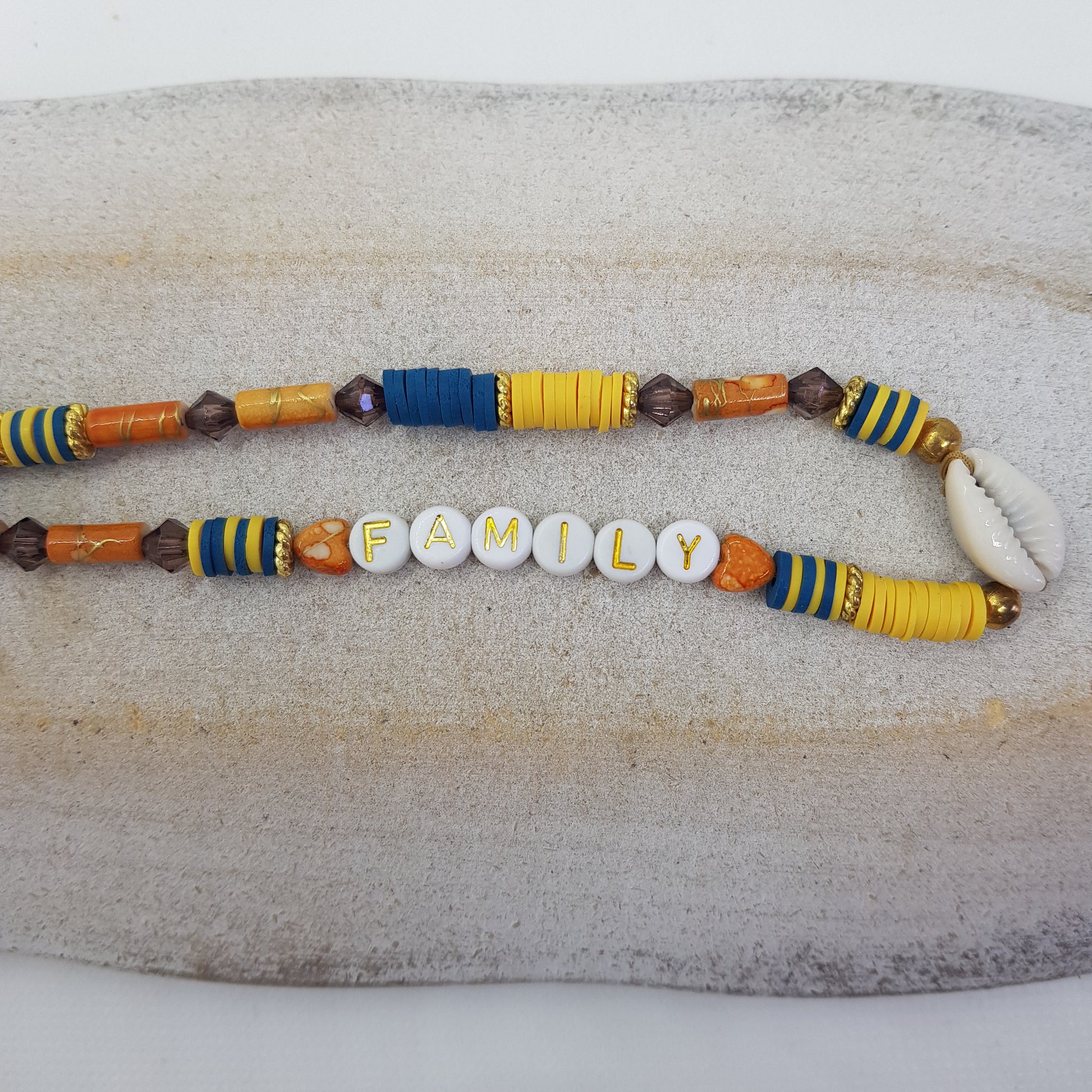 Confectionné aussi avec des perles dorées, il est orné de perles lettres blanches écriture dorée et se termine par un coquillage nacré.