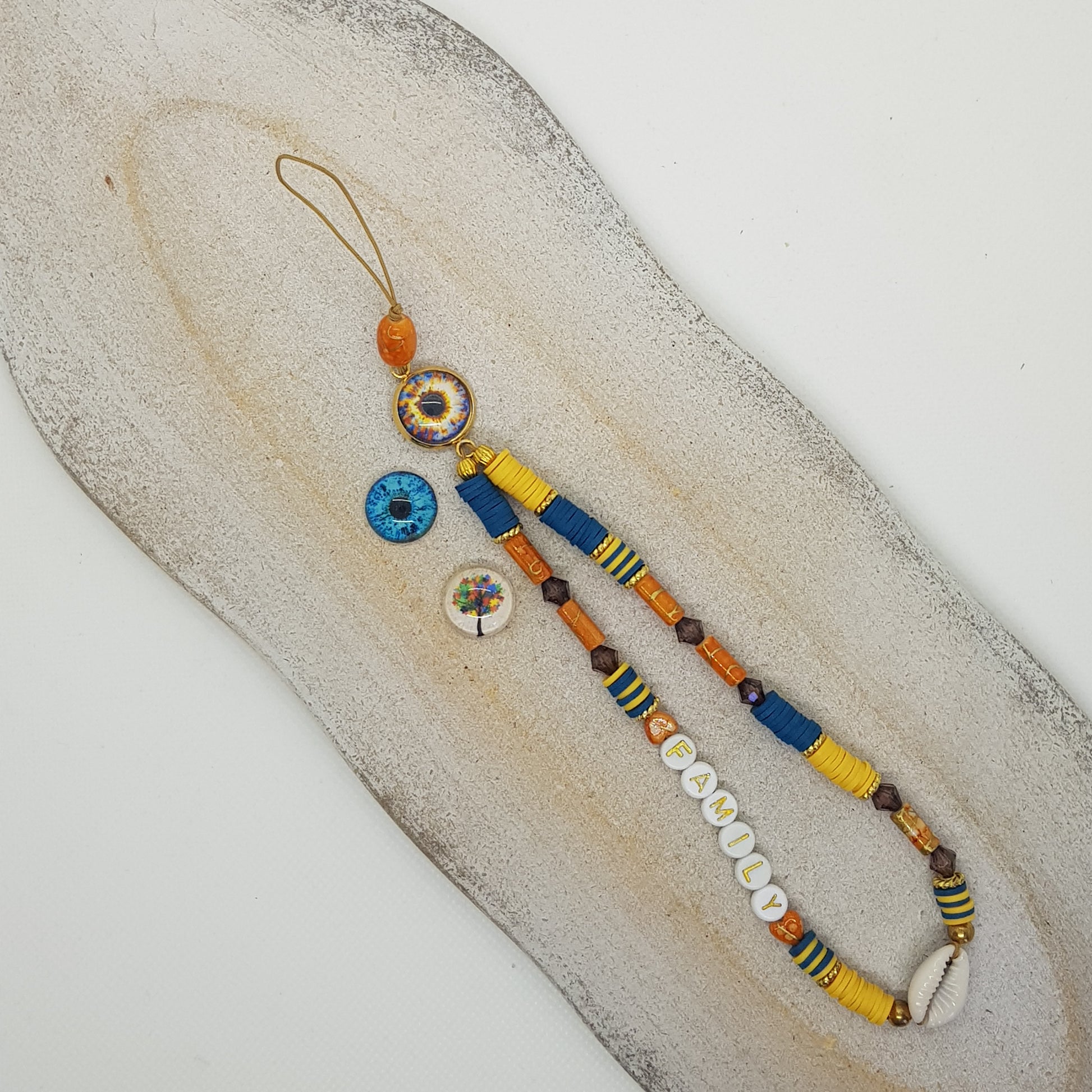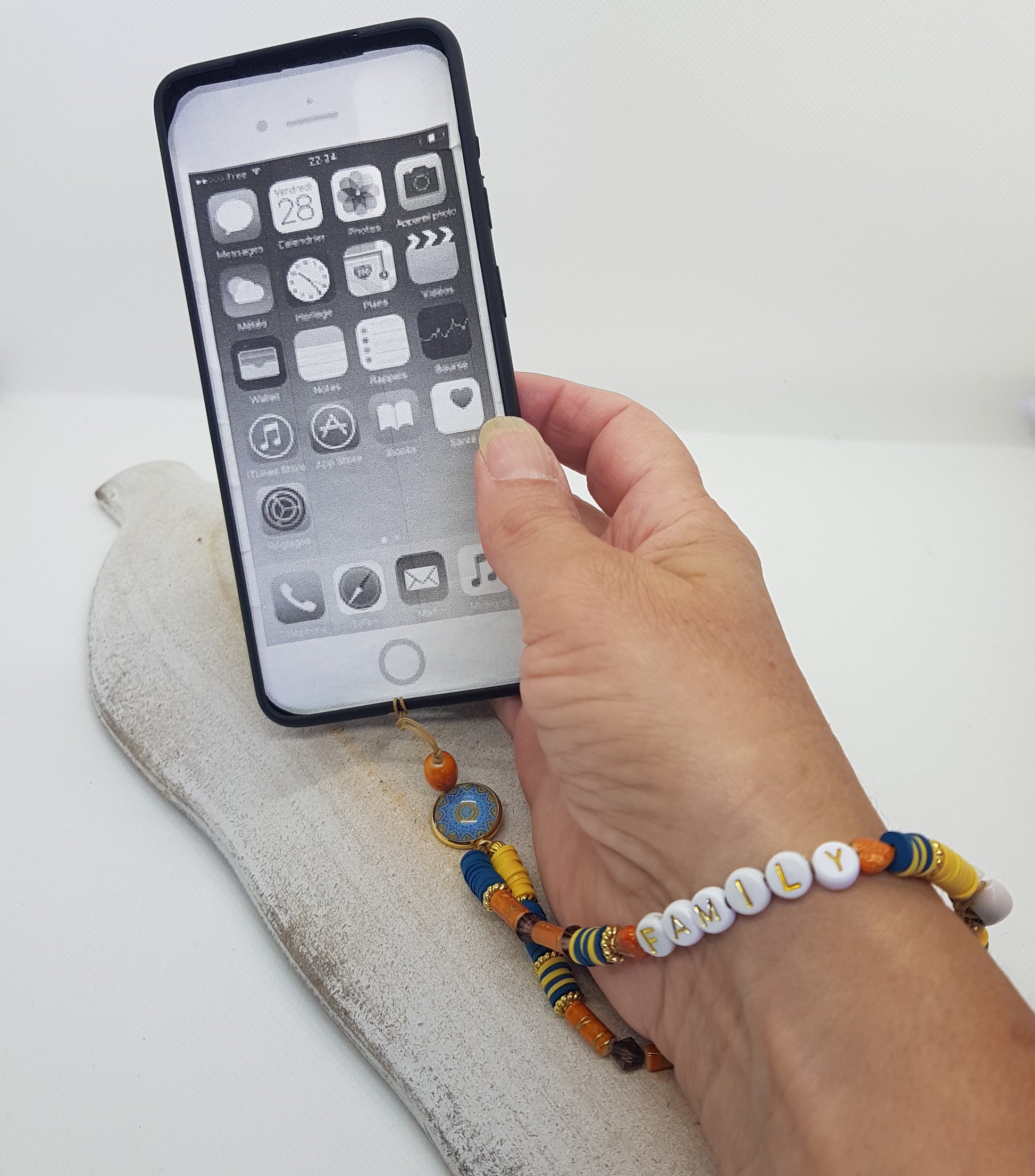 Cordon de téléphone bordé de perles heishi et d’acrylique. Il s’attache à votre coque de téléphone grâce à une attache dragonne. Votre accessoire de téléphone pourra vous accompagner dans toutes vos aventures.