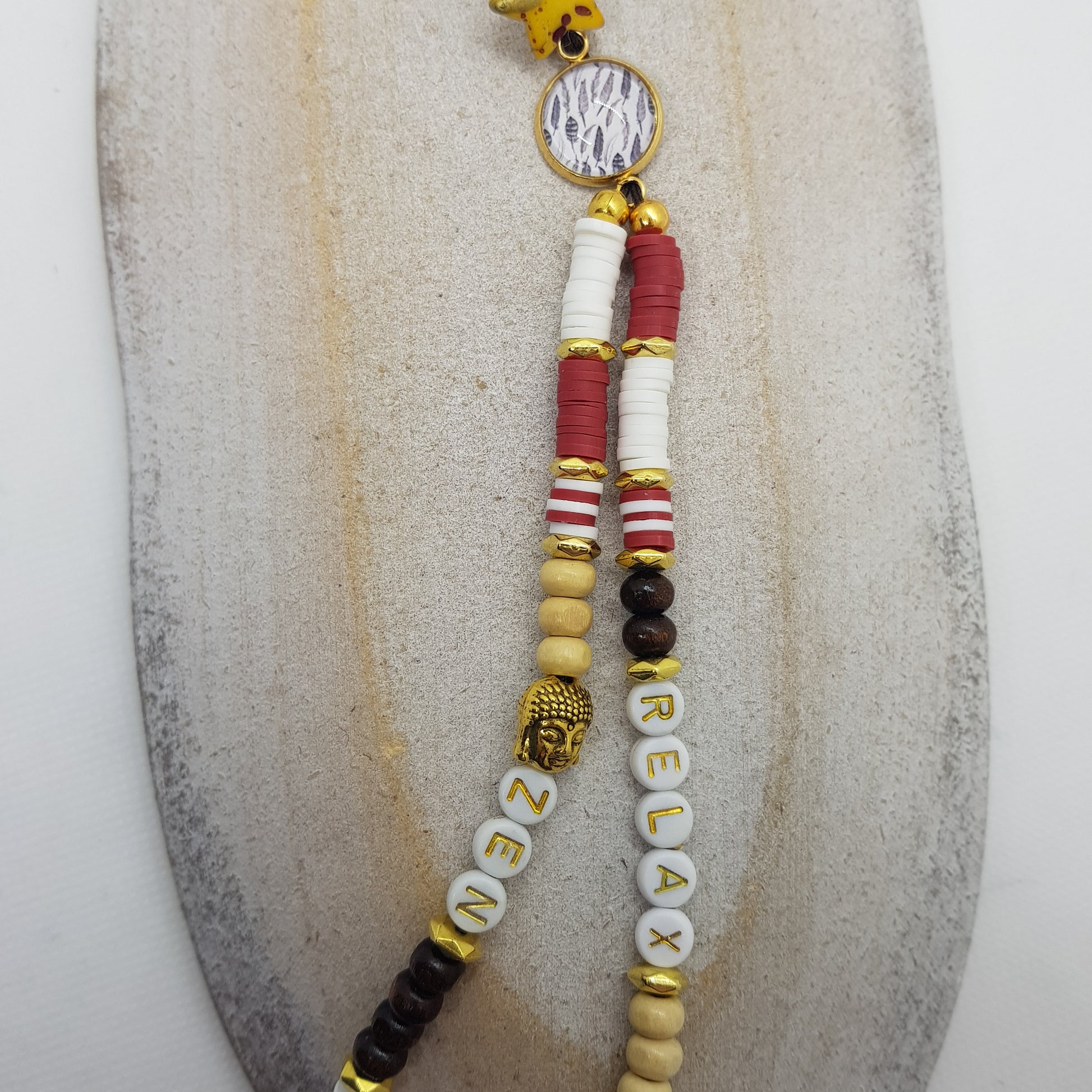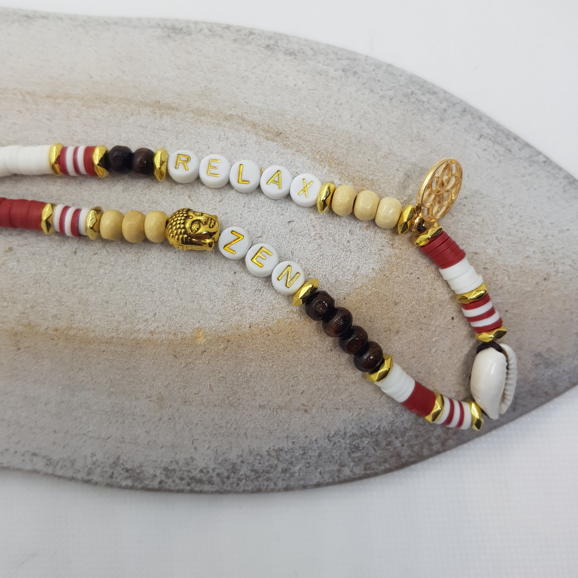 Confectionné avec des perles heishi et bois, il est orné de perles lettres écriture dorée et monté sur un cordon souple.