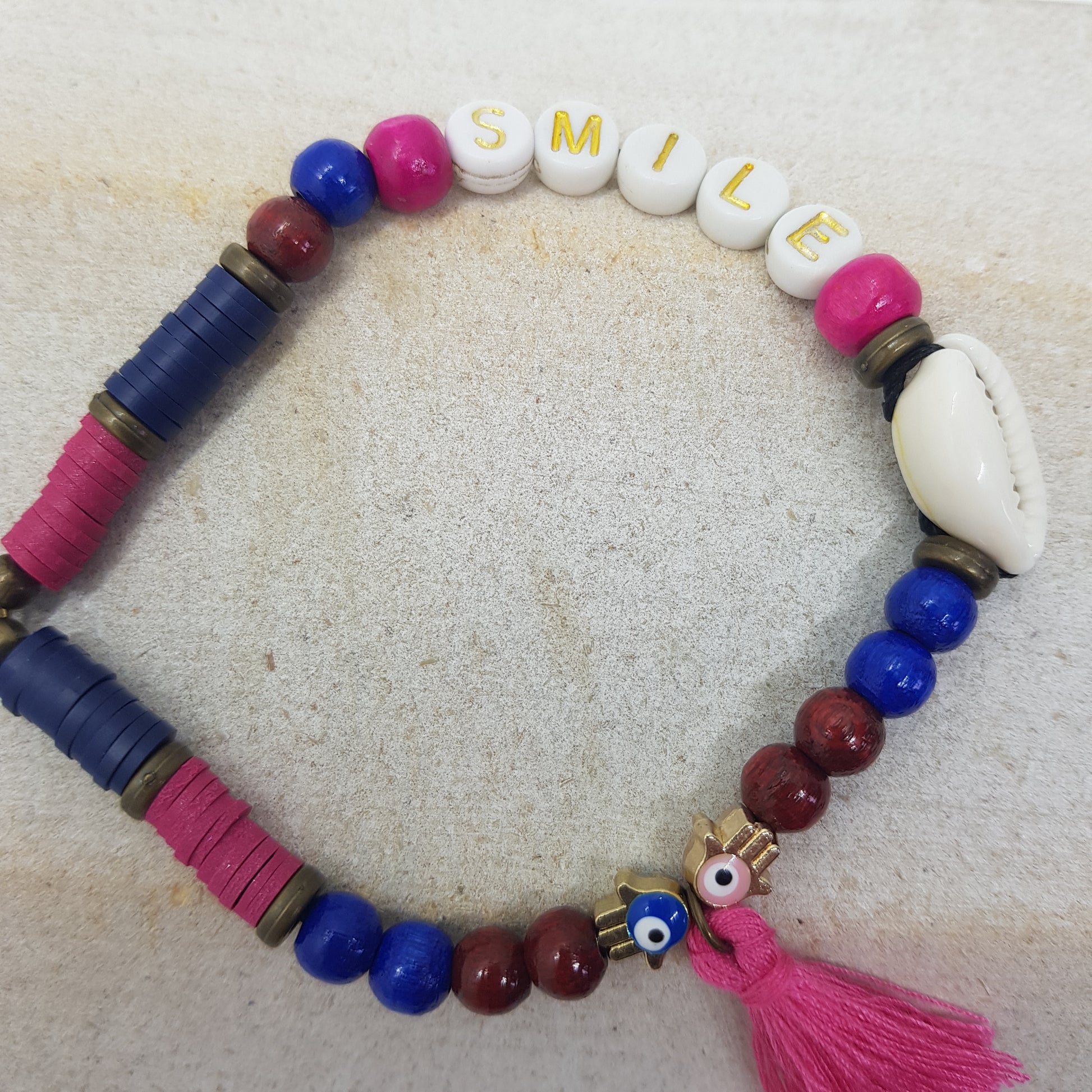Confectionné avec des perles en bois et heishi colorées bleues, roses et bordeaux, est orné de perles lettres écriture dorée, le tout monté sur un cordon souple.