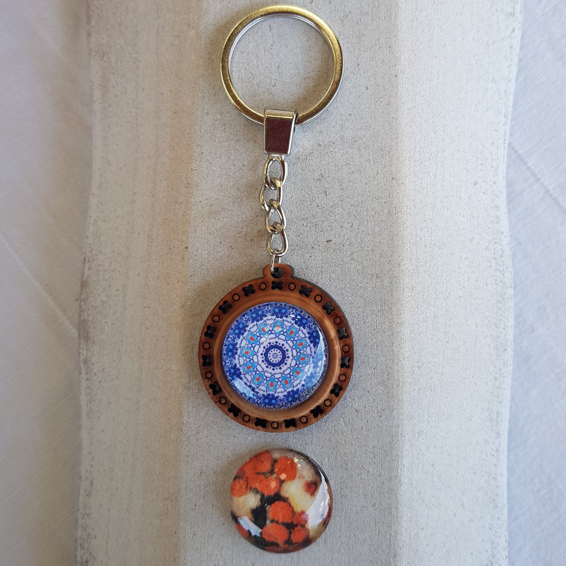 En associant le bois et le métal, le porte-clé artisanal rond est prêt à accueillir votre cabochon en verre effet loupe.