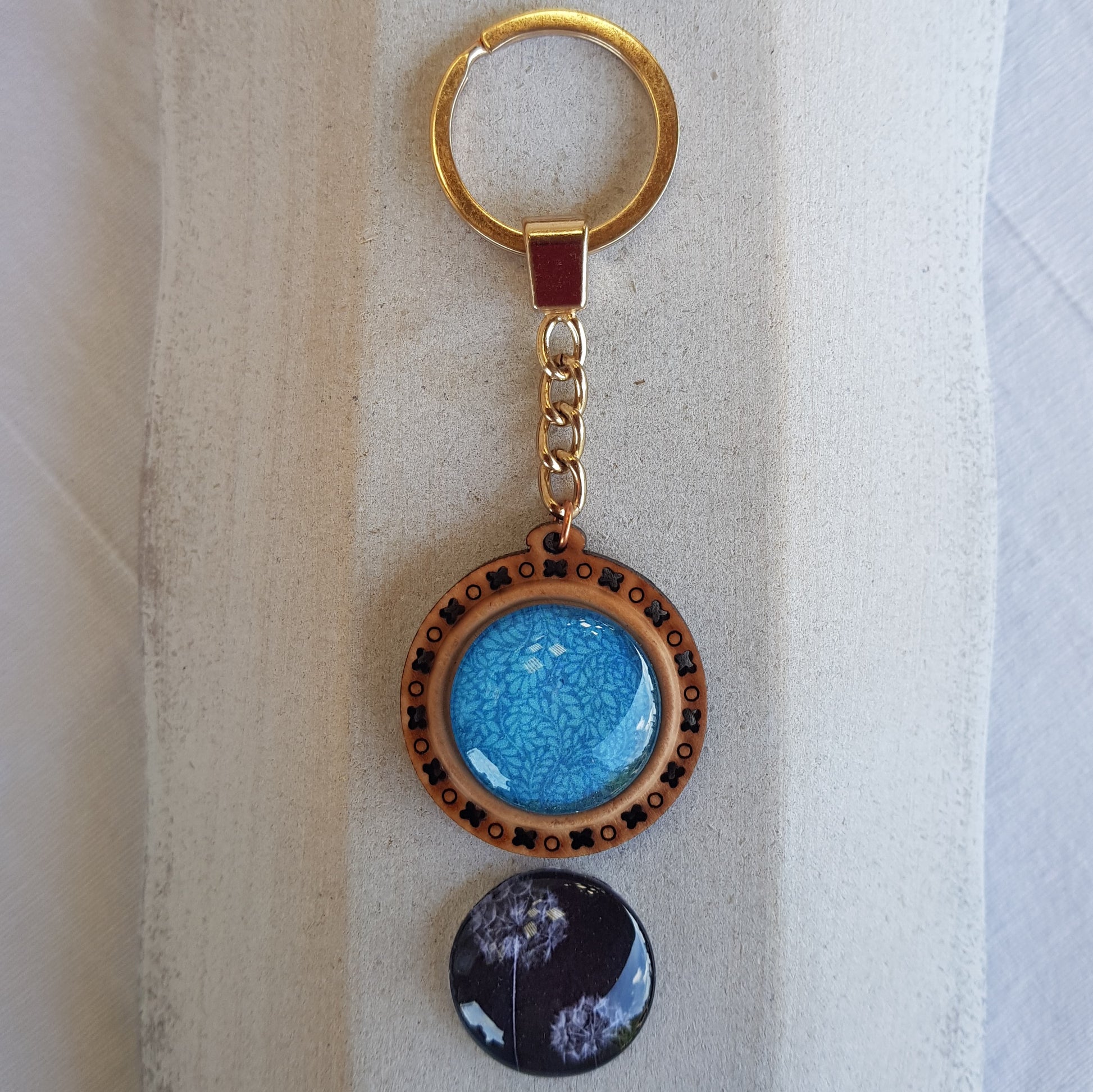Le pendentif en bois rond et orné d'incrustations de ce porte-clé, sera un atout essentiel pour conserver vos clés ou tout simplement le mettre en bijou de sac.